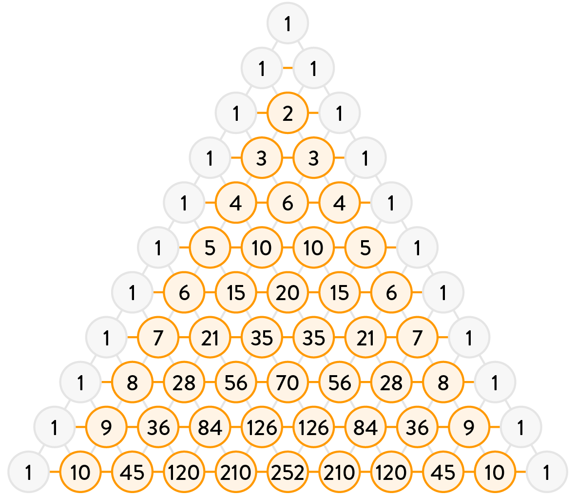 We blikken alvast even vooruit naar volgend jaar. Over het getal 2026 valt zo te zien helaas wat minder interessants te vertellen dan over 2025 vorig jaar. Het leukste dat we hebben gevonden, is dat 2026 precies de som is van de hieronder oranje gemarkeerde vakjes in de driehoek van Pascal — je weet wel, dat schema van getallen waarin elk getal gelijk is aan de som van de twee erboven.